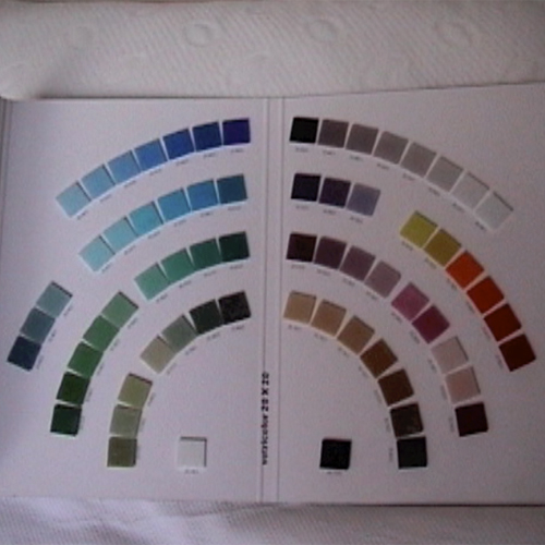 Mary Heilmann asked me to interpret her abstract painting for this commission. We selected the luminous sunbaked colors from Bisazza Mosaic Tiles for her off-kilter geometric fields and gesturally sweeping outlines. In order to make a template the actual size (25 foot by 25 foot), I sewed together five canvas drop cloths, nailed the huge canvas to the side of my barn, projected her painting, then outlined the shapes with a paintbrush. Such was shipped ahead and became the cartoon I used to lay-out the mosaic. In the Spanish sun, the colors radiate off the plaster walls of the villa and the movement of water in the reflecting pool wonderfully accentuates form and line.